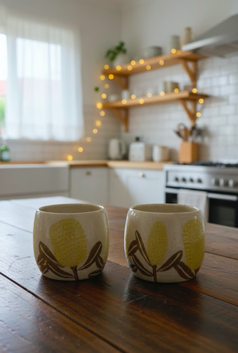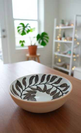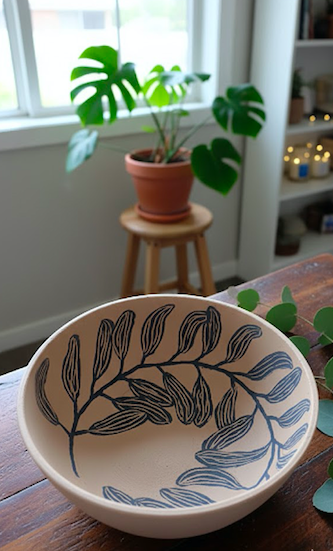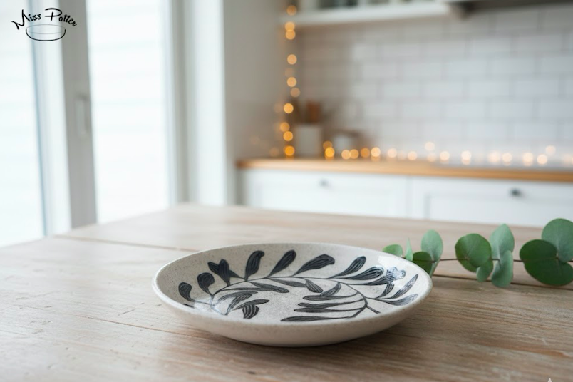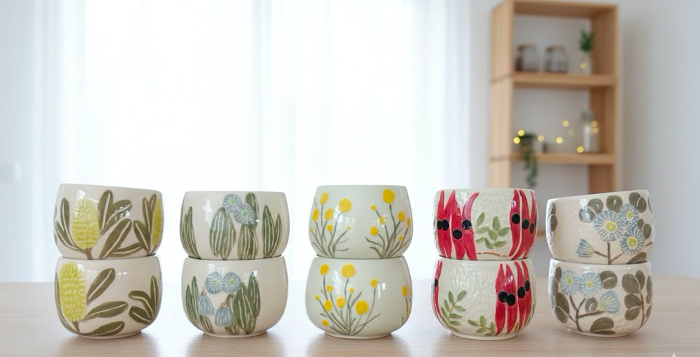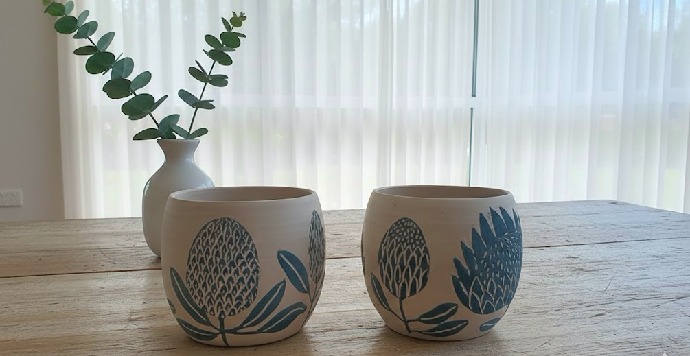 Each native motif—from the intricate Banksia pods to the flowing Gum leaves—is first painted onto leather hard clay, and then meticulously hand-carved. This revealing process creates a stunning high-contrast effect, showcasing the raw, earthy clay beneath creating a textured motif that is unique.