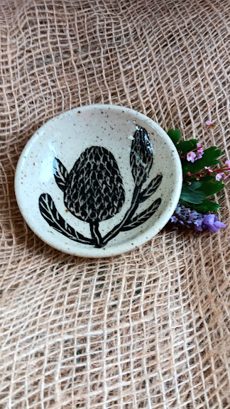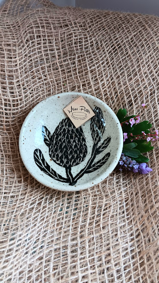 Artisan Detail in a Small ForThese dipping dishes are thrown using a mixed textured clay, providing a lovely organic feel and a subtle, rustic look. The star of the show is the intricate sgraffito Banksia flower, meticulously hand-carved into the surface. This technique ensures the iconic Australian flora motif is sharp, permanent, and unique to each piece.