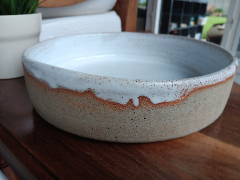 The huge serving dish features a striking two-tone design. The base showcases the natural, speckled beauty of the raw stoneware clay, providing an earthy, tactile foundation. This is beautifully contrasted by a rich, creamy white glaze that artfully cascades down the sides, creating a distinctive effect that makes it uniquw. The smooth glazed interior provides a pristine surface for serving.