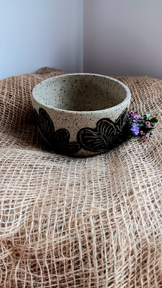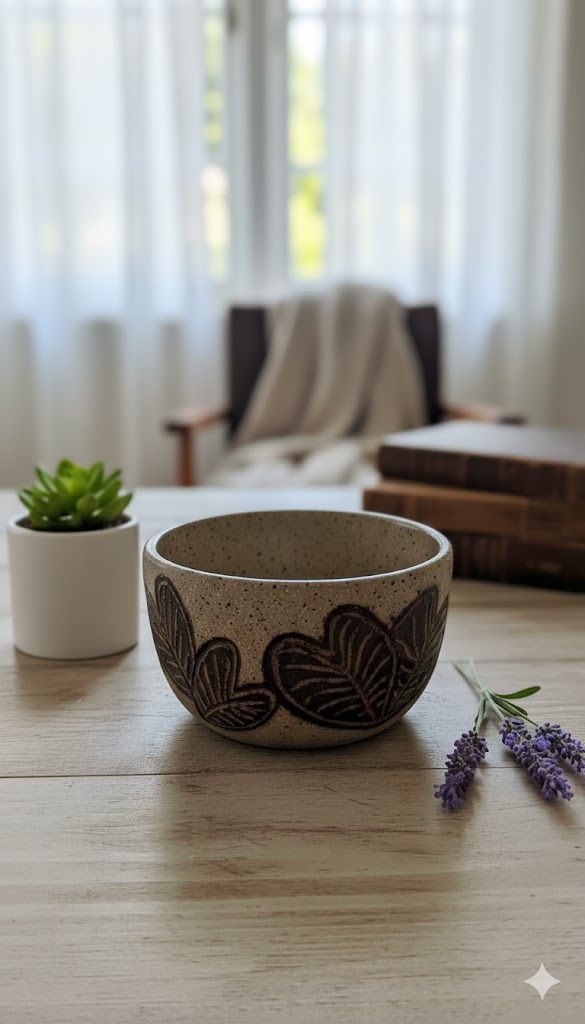 The Detail: This rugged exterior is dramatically offset by the smooth, carved sgraffito leaf pattern. These leaves are meticulously detailed and finished with a clear gloss glaze, which makes the pattern pop against the matte background. The smooth rim provides a final, appealing contrast to the rougher clay body.