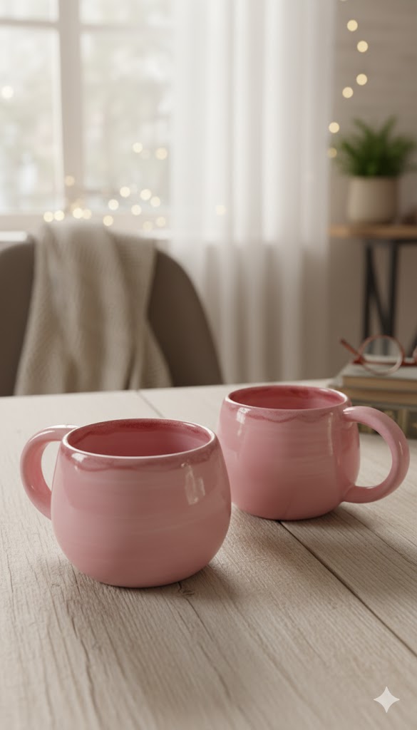 Soft Pink Glaze: Dressed in a beautiful, blush pink glaze, these mugs evoke a sense of tenderness and warmth. The color has a lovely, subtle variation, almost like a watercolor, making each piece unique.