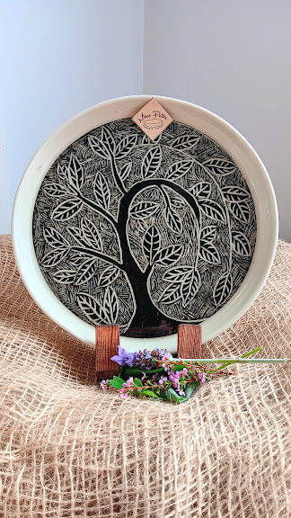 This piece immediately draws the eye, featuring a beautiful and intricate sgraffito bent tree design. The organic, slightly stylized silhouette of the tree is hand-carved (sgraffito) into the clay’s surface, ensuring the pattern is sharp, permanent, and unique. The design is complemented by the rich surface texture of the stoneware clay, which enhances its tactile quality and rustic appeal.